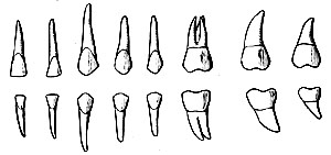 De plus, on connaît le rôle métabolique des sels de calcium dans le développement du squelette et plus particulièrement des différents tissus dentaires. Que survienne un trouble de leur métabolisme durant la période de l'odontogenèse, par exemple une carence d'apport ou un défaut d'absorption, la minéralisation des tissus dentaires s'en trouve perturbée et l'on sait leur caractère définitif. Or l'expérience clinique montre qu'en donnant durant cette période l'un ou plusieurs de ces sels, en dilutions, on favorise une meilleure minéralisation des tissus concernés. Allant encore un peu plus en avant, l'expérience clinique a montré que la prédominance de l'un de ces sels est à l'origine du développement d'un type morphologique particulier, répondant et définissant pour chaque sel un ensemble caractéristique: morphologique, comportemental, plus un certain nombre de prédispositions à certaines pathologies, dont la carie dentaire. Plusieurs générations d'étudiants en chirurgie dentaire ont appris à distinguer les dents "carboniques", "phosphoriques" ou "fluoriques", sans savoir toujours que ces descriptions sont dues à un stomatologiste homéopathe, Bertrand de NEVREZE ( 1877-1951), dont les travaux remontent au début du XX° siècle, à la suite de ceux du médecin homéopathe suisse, Antoine NEBEL, auteur d'une conception de trois constitutions minérales. On peut même mesurer l'influence des thèses de de Névrezé car elles sont encore décrites dans la revue non homéopathique: "La Pratique dentaire" (volume 1-1985-n°1-p.23).