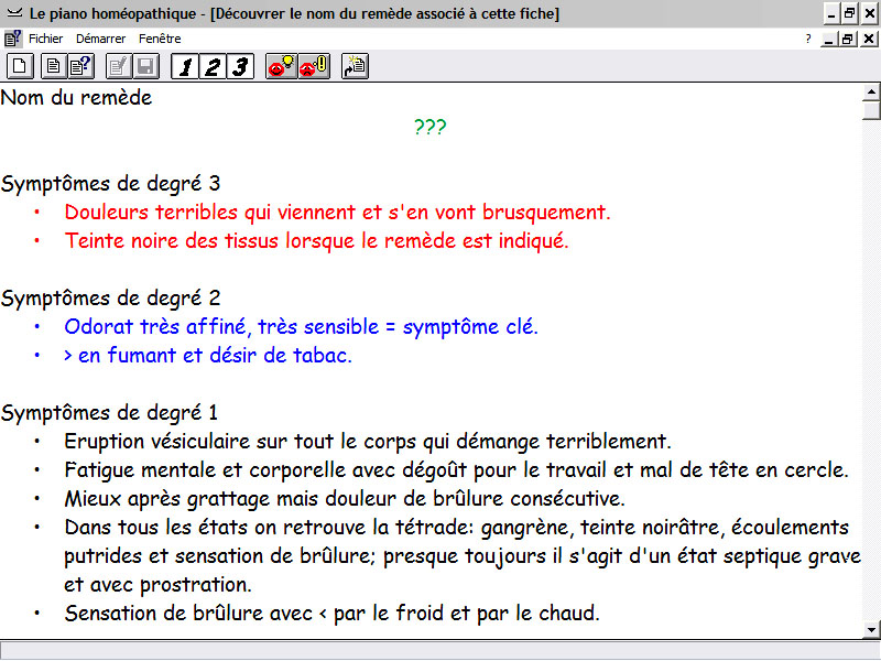 Ci-dessous = exemple d'une fiche d'exercice. Il est possible de faire apparaître successivement des symptômes au degré faible, ou moyen ou fort ou les trois en même temps. Lorsque l'on croit connaître le médicament, on le précise dans une liste, on a alors soit la confirmation, soit l'infirmation sous une forme ironique "Erreur de mémoire ?".