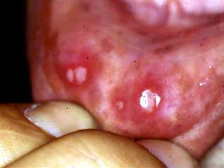 Petites plaques d’ulcérations disséminées dans la bouche