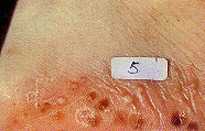 Une irritation cutanée = éruptions vésiculeuses contenant un liquide opalescent ou purulent, souvent masqué par des croûtes blanchâtres. Elles s'accompagne d'un prurit intense et erratique.