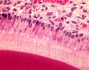 Odontoblastes vus au microscope électronique après coloration. Ces cellules sont présentes dans la pulpe de la dent et leurs prolongements atteignent la jonction dentie/émail. Leur rôle est la "fabrication" de la dentine.