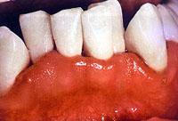 Gencive enflammée, œdématiée, ulcérée, sanguinolente au moindre contact. Gingivite d’aspect scorbutique. Maladie parodontale avec poches suppurées.