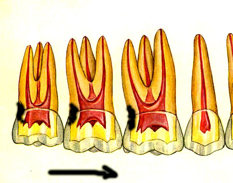 2. Les dents se carient au niveau des faces distales, sous le collet, en commençant par les molaires les plus postérieures et en évoluant progressivement vers l’avant. Ce type de carie a été décrit par Roger SCHMITT.